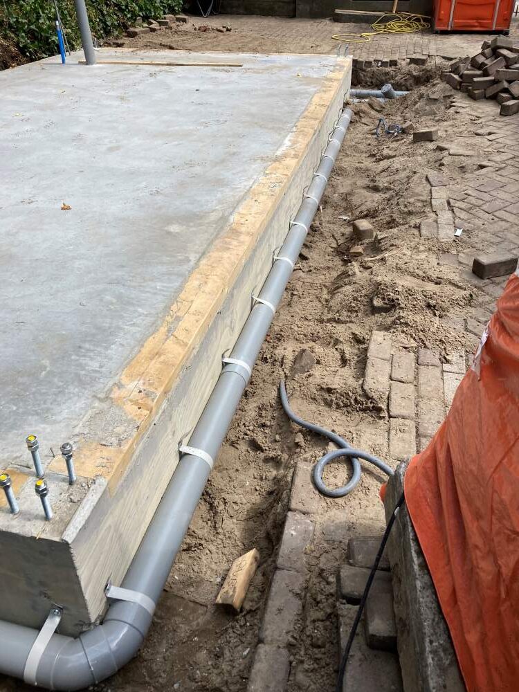 • Nieuwe afvoerleidingen gelegd en stevig bevestigd tegen de fundering