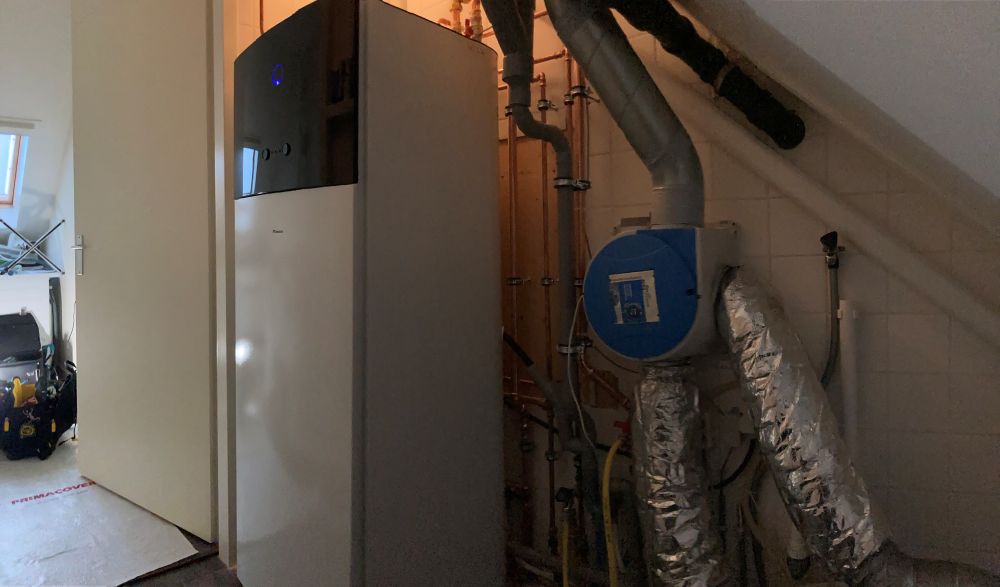 De ruimte onder het schuine dak bood beperkte werkruimte, maar dankzij slimme plaatsing van de componenten is alles compact, toegankelijk én onderhoudsvriendelijk gemonteerd. De gekozen Daikin warmtepomp is fluisterstil en past perfect bij deze goed geïsoleerde woning.